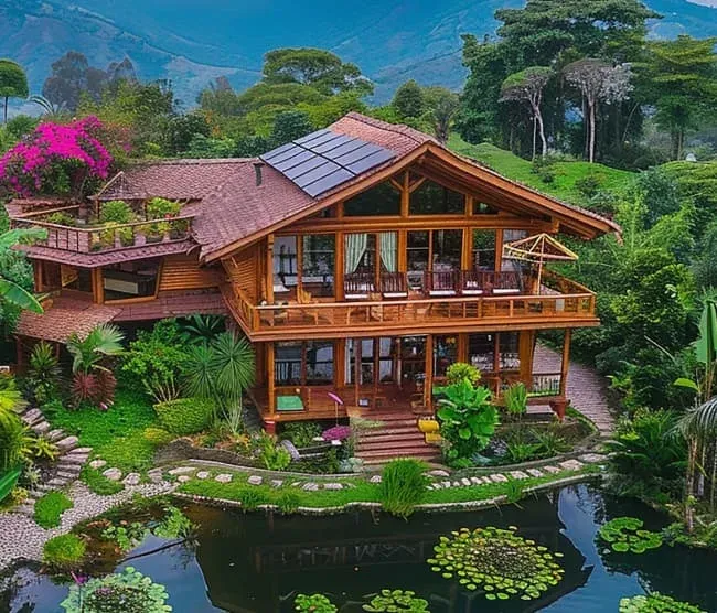 Throughout the interior, eco-friendly materials like reclaimed wood, bamboo flooring, and recycled glass countertops create a luxurious yet sustainable ambiance.